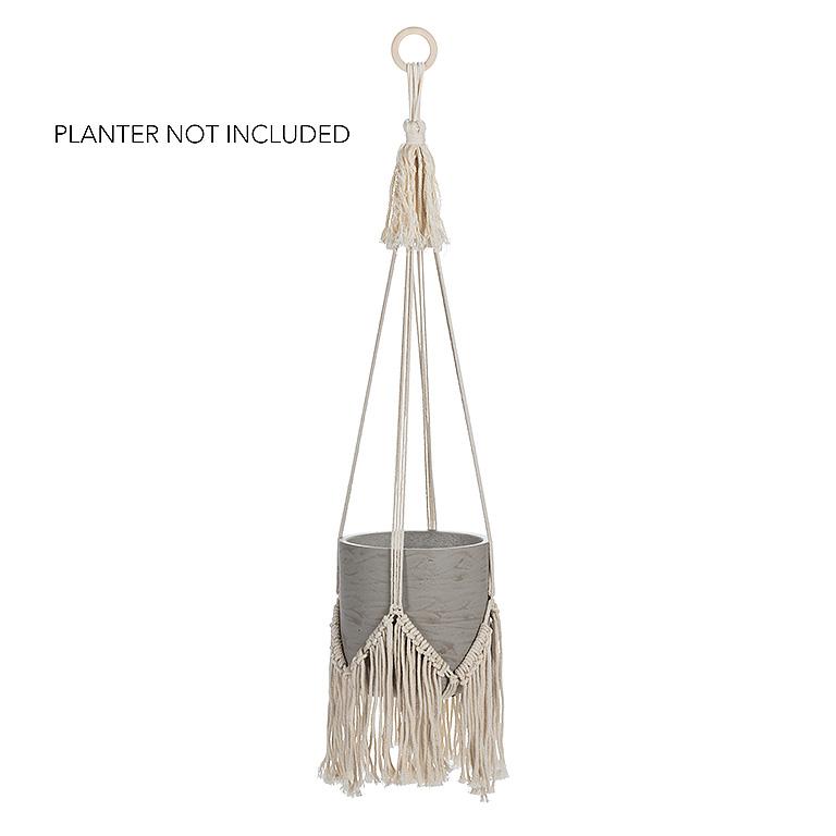 Add some vintage style to your home with this macrame style Planter Hanger with Fringe. Crafted with cotton and wood, this ivory hanger with fringed bottom can hold multiple sizes of planters (4-6 inches best) and complements any space. Other planter hanger designs also available. Planter not included.